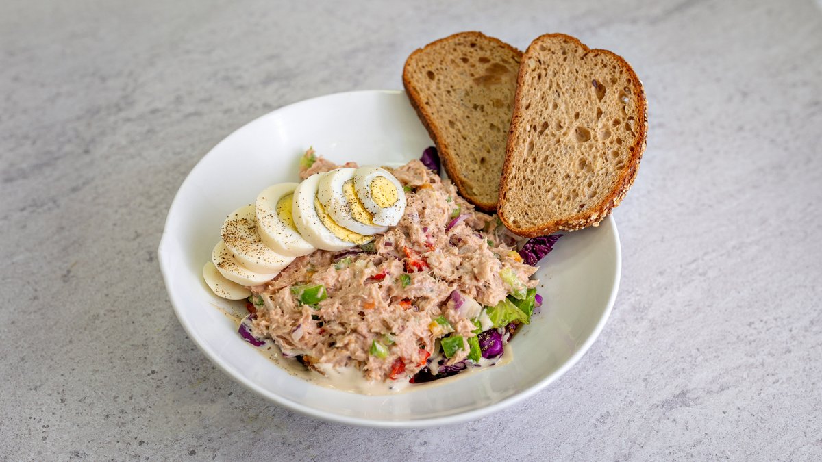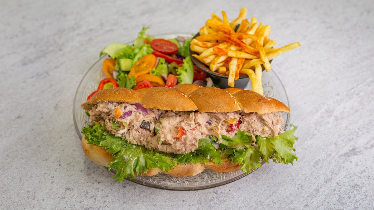 טונה, חסה לאליק, אריסה, סלט טונה,עגבניה ומלפפון חמוץ בלחם לבחירה מוגש עם סלט ותוספת חמה