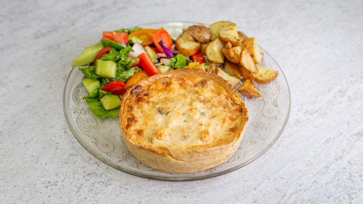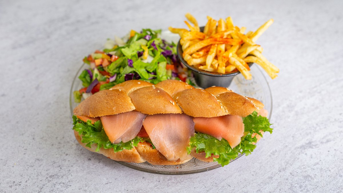 סלמון מעושן, שמנת שום שמיר, חסה לאליק, עגבניה, בצל ירוק, בצל סגול וצנונית בלחם לבחירה מוגש עם סלט ותוספת חמה