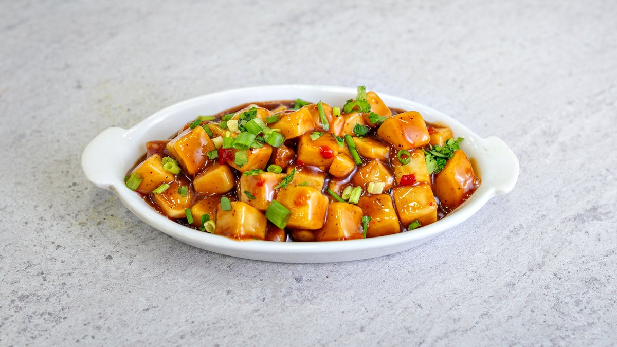 קוביות תפוח אדמה מוקפצות ברוטב צילי עם בצל ירוק מעל | ללא גלוטן | טבעוני