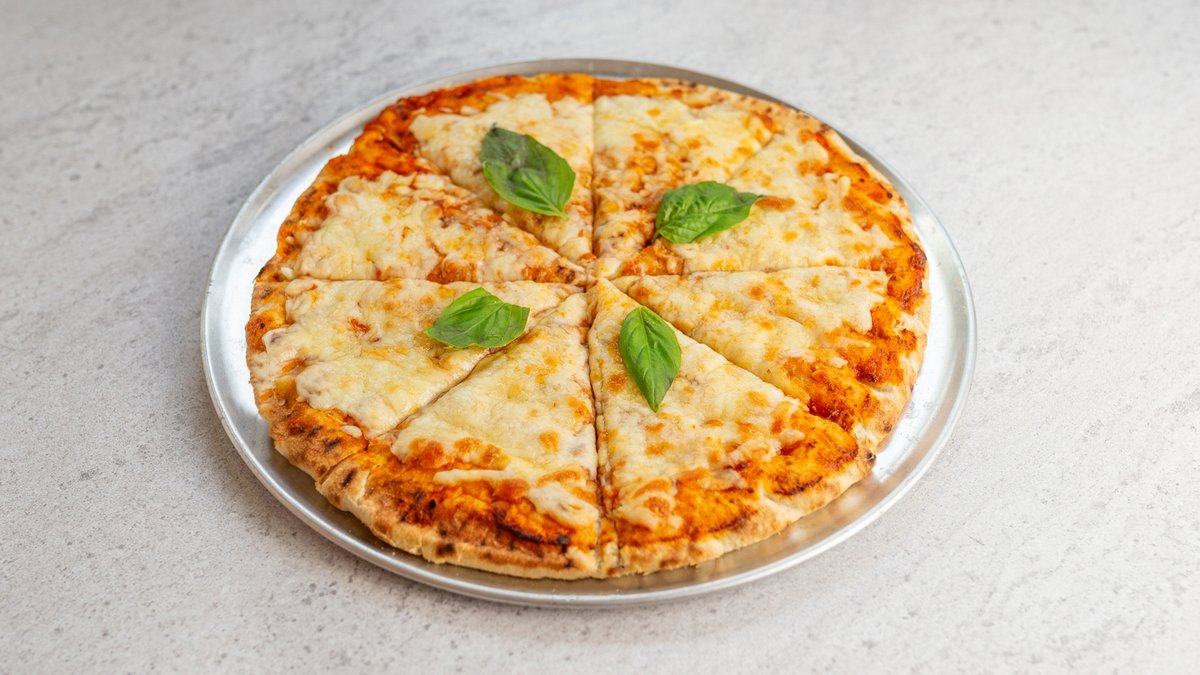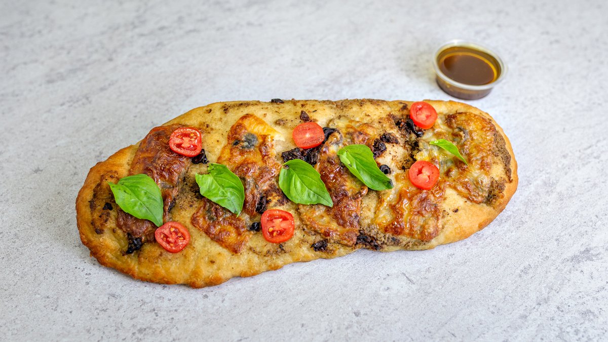 פוקאצ׳ה אפויה בתנור אבן עם פסטו, מוצרלה, עגבניות שרי ובזיליקום טרי