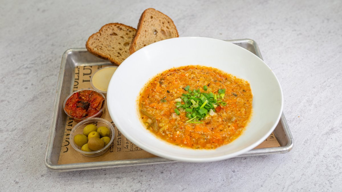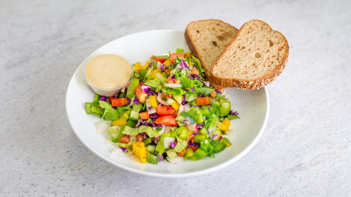 חסה רומית, מלפפון, עגבנייה, בצל סגול, זיתים שחורים, פלפל אדום, עגבניות שרי, צנונית, פטה 5% מעודנת וזעתר מוגש עם לחם, חמאה, טחינה וזיתים