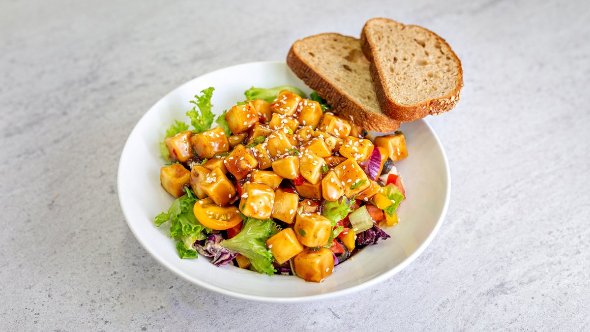 רצועות טופו צרובות ברוטב צ׳ילי, פסטו בזיליקום, עגבניה, חסה לאליק, מלפפון חמוץ, צנונית ובצל ירוק בלחם לבחירה | טבעוני מוגש עם סלט ותוספת חמה