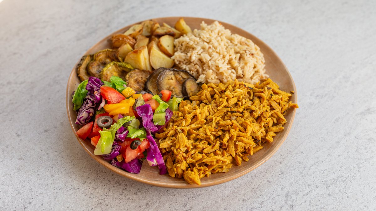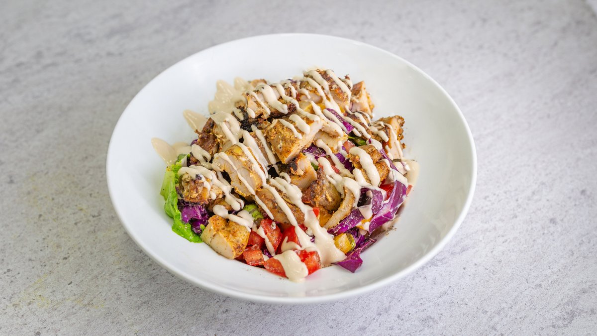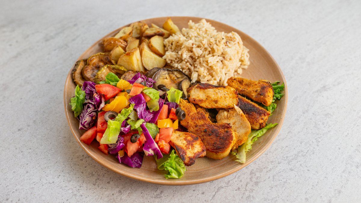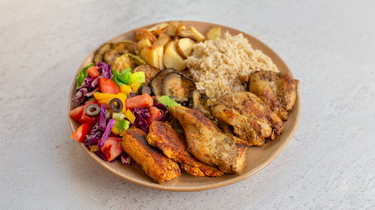 פרגית, טחינה, סלט עגבניות חריף, חציל אפוי, מלפפון חמוץ ובצל סגול בלחם לבחירה מוגש עם סלט ותוספת חמה