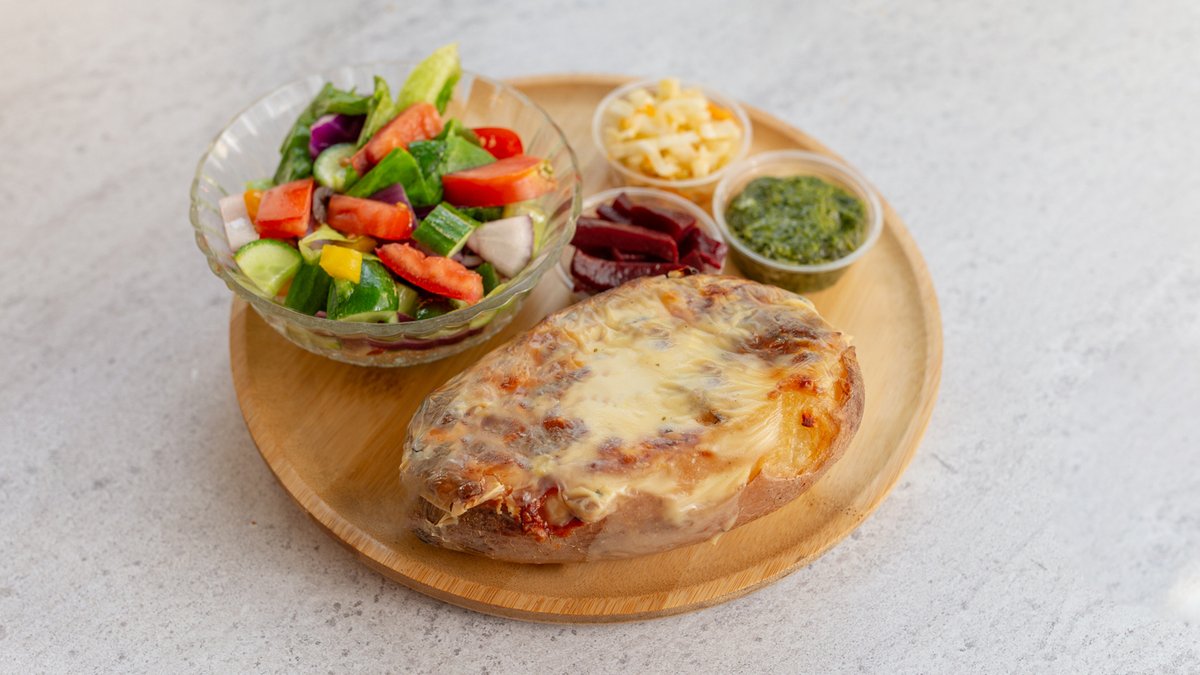 חביתת חומוס ופלטת מטבלים:, סלט חצילים, סלט כרוב, סלט סלק, פסטו, ממרח עגבניות מיובשות, טחינה, תפו"א אפוי, חמוצים וזיתים מוגש עם לחם, סלט ירקות טרי, מיץ סחוט וקפה קר