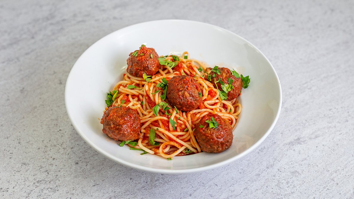 רוטב עגבניות, קציצות בקר, פטרוזיליה, בזיליקום טרי ושום מוגש עם סלט ירוק בויניגרט הדרים