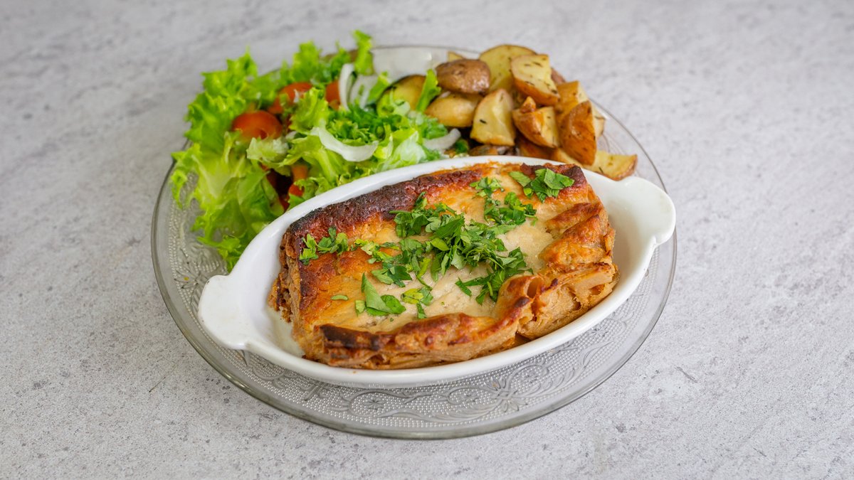 בורקס תפוח אדמה, טחינה, חציל, ביצה קשה, מלפפון חמוץ, פטרוזיליה, סלט ירקות וחמוצי הבית