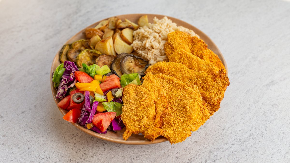 שניצל, מטבוחה, חציל, חסה לאליק, מלפפון חמוץ, לימון כבוש ובצל סגול בלחם לבחירה מוגש עם סלט ותוספת חמה