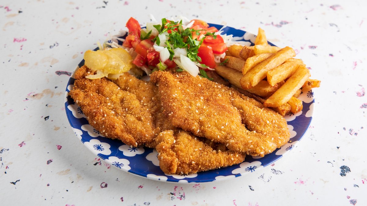 שניצל אמיתי נעשה במקום עם תוספת לבחירה