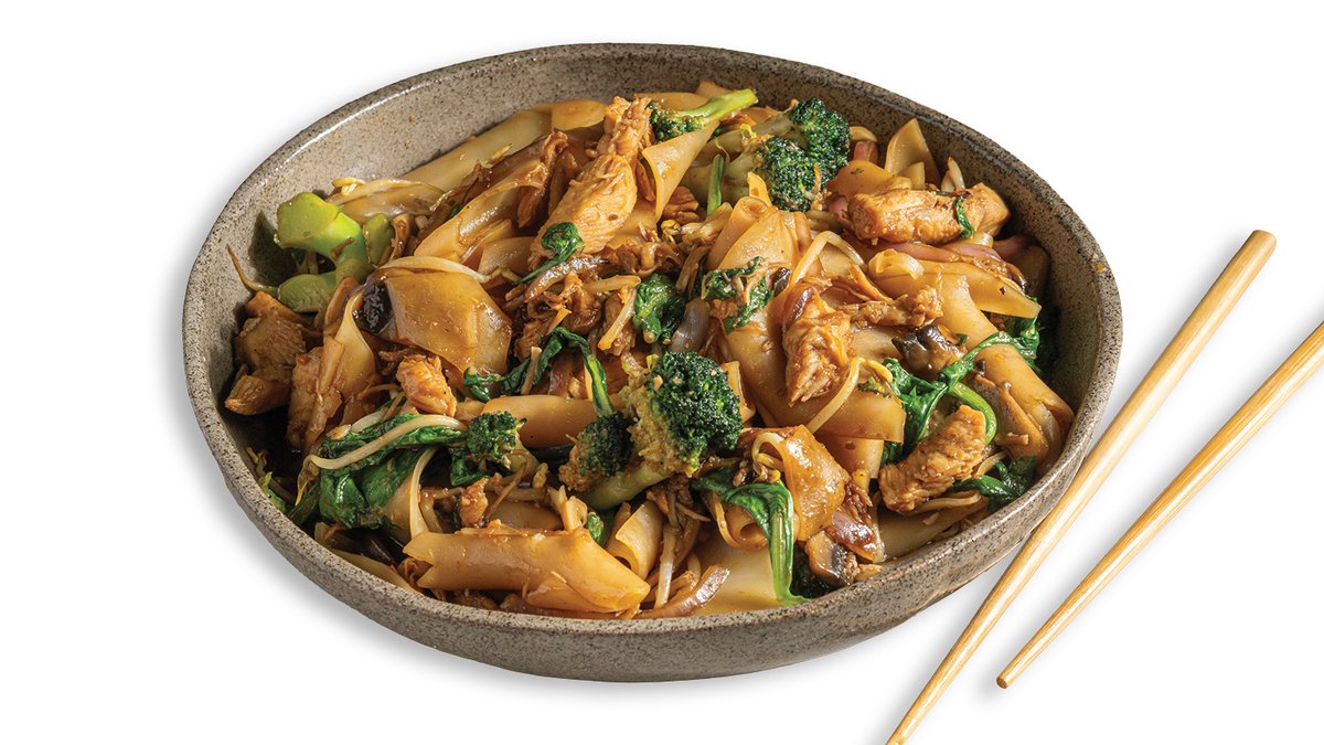 אטריות אורז רחבות, נתחי עוף /בקר /טופו/סלמון טמפורה , נטיפי ביצים, כרוב, גזר, נבטים, בצל סגול וירוק ברוטב סויה וצ’ילי, מעוטר בכוסברה ,בוטנים ולימון