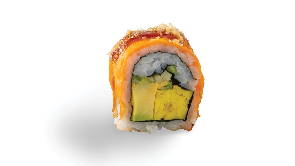 אורז סושי, טופו קריספי, אבוקדו, גזר, מלפפון, בטטה, בצל ירוק ופנקו
