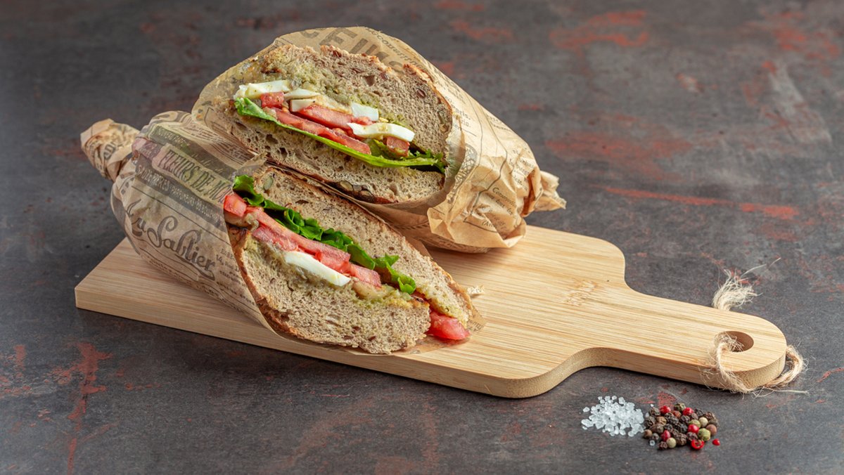 כריך ג'בטה עם פסטו, חסה, עגבניה, ובולגרית
