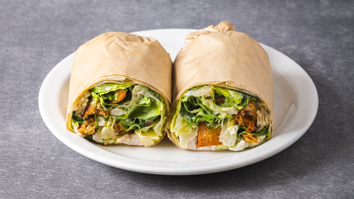 חסות, בזיליקום, נענע,בצל שאלוט, קרוטונים ופרמז'ן ברוטב קיסר עם עוף עטוף בראפ