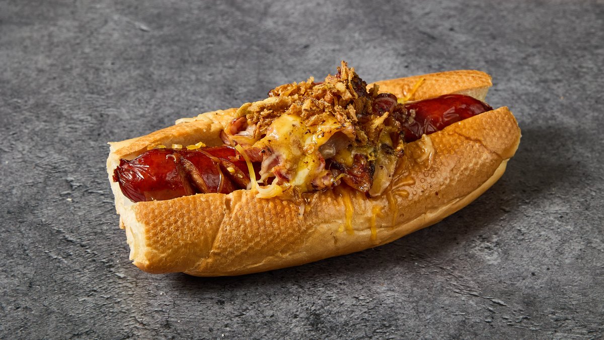 נקניקיית בקר קראנץ' עסיסית בלחמניה מאודה עם רטבים לבחירה, כרוב כבוש חם, חמוצים במלח ובצל חי בפנים הלחמניה. מעל **דאבל גבינות צ'דר וגאודה מותכות ושבבי בצל קריספי.