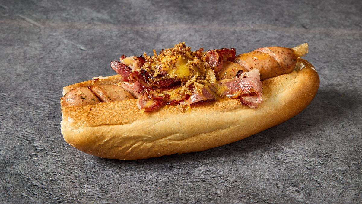 נקניקיית בקר קראנץ' עסיסית בלחמניה מאודה עם רטבים לבחירה, כרוב כבוש חם, חמוצים במלח ובצל חי בפנים הלחמניה. מעל בייקון חזיר, גבינת צ'דר ובצל קריספי מטוגן.