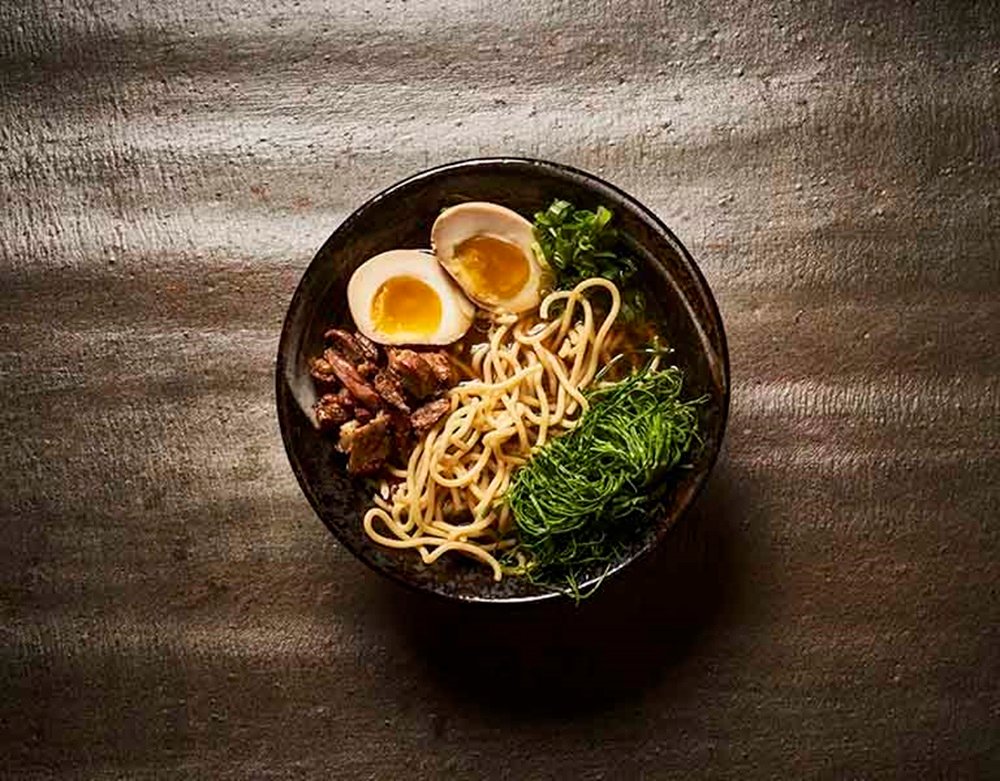 אטריות אורז בסויה שחורה עם סינטה (מכיל סויה וביצה), בצל ירוק, ברוקולי, פאק צ'וי, שאלוט, פטריות, חביתה, כוסברה, שבבי קוקוס קלוי ובוטנים. מנה מתוקה