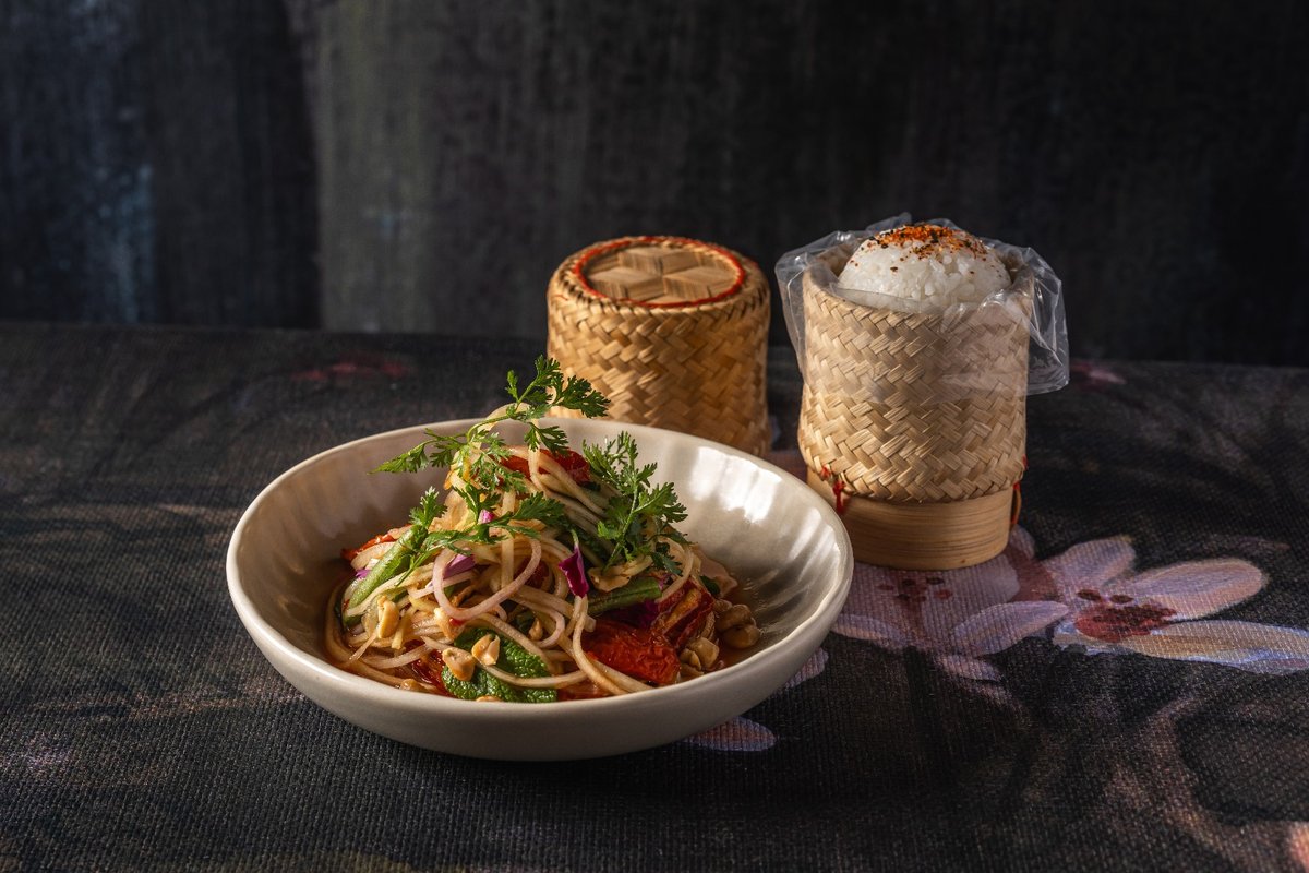 פפאיה ירוקה, עגבניות שרי, עגבניות שמש, שעועית ירוקה, שום, כוסברה, צ'ילי חריף ובוטנים קלויים. רוטב נאם פלה פריק וסטיקי רייס
