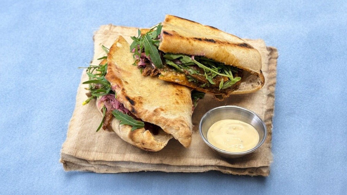 בצק פיצה מחמצת, בשר מפורק, איולי כמהין, סלט כרוב איטלקי ורוקט