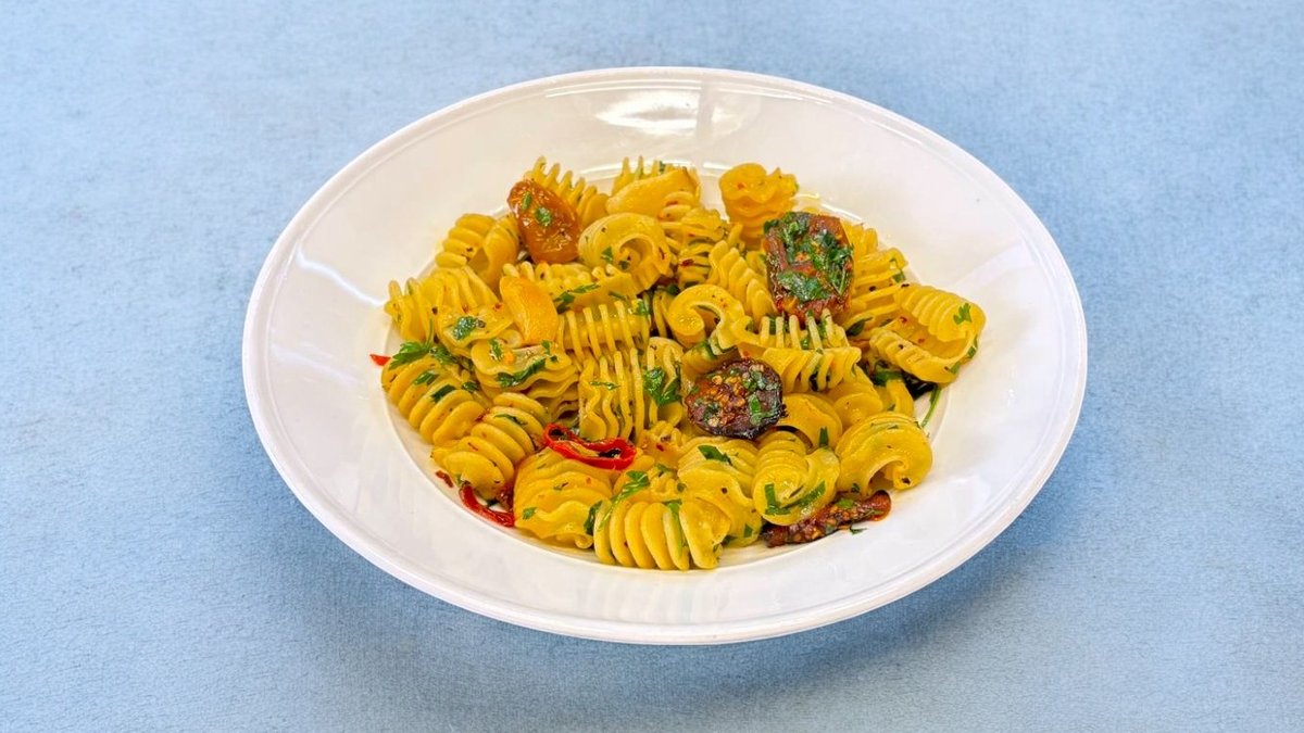 פסטה רדיאטורה טרייה, שמן זית, שום, צ'ילי, פטרוזיליה וקונפי שרי מוגש עם פרמז׳ן בצד