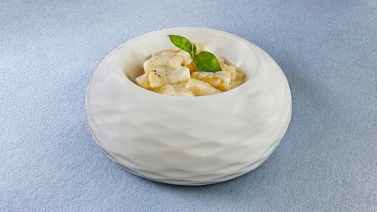 ניוקי טרי, שמנת, פסטו בזיליקום, פרמז'ן וצנוברים מוגש עם פרמז׳ן בצד