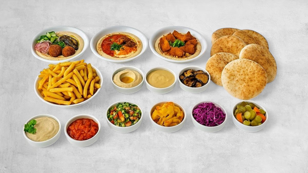 חומוס, טחינה, חריף, סלט (מלפפון, עגבניה), חמוצים
