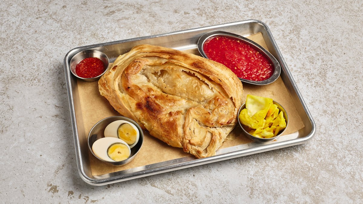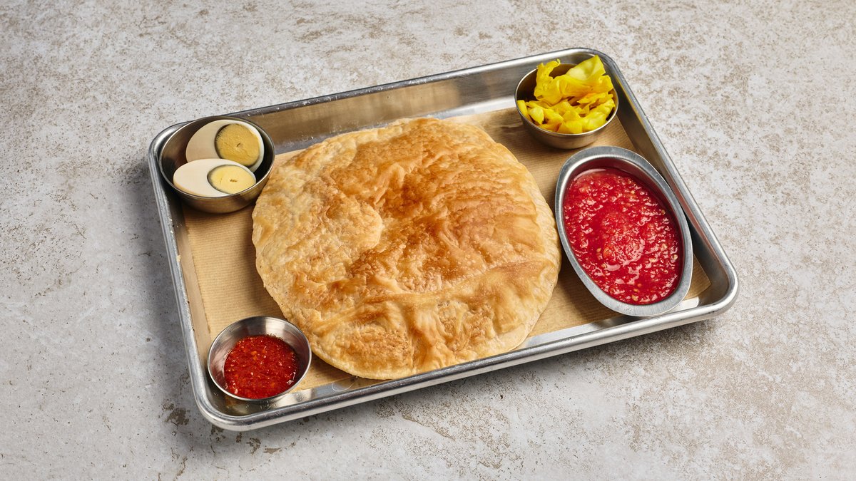 מלאווח בעבודת יד, מוגש עם רסק, חריף, ביצה קשה וחמוצים
