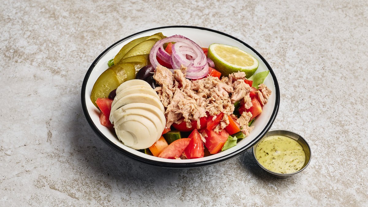 חסה, מלפפון, עגבנייה, שמן זית, זיתים, בצל סגול, מלפפון חמוץ וביצה קשה