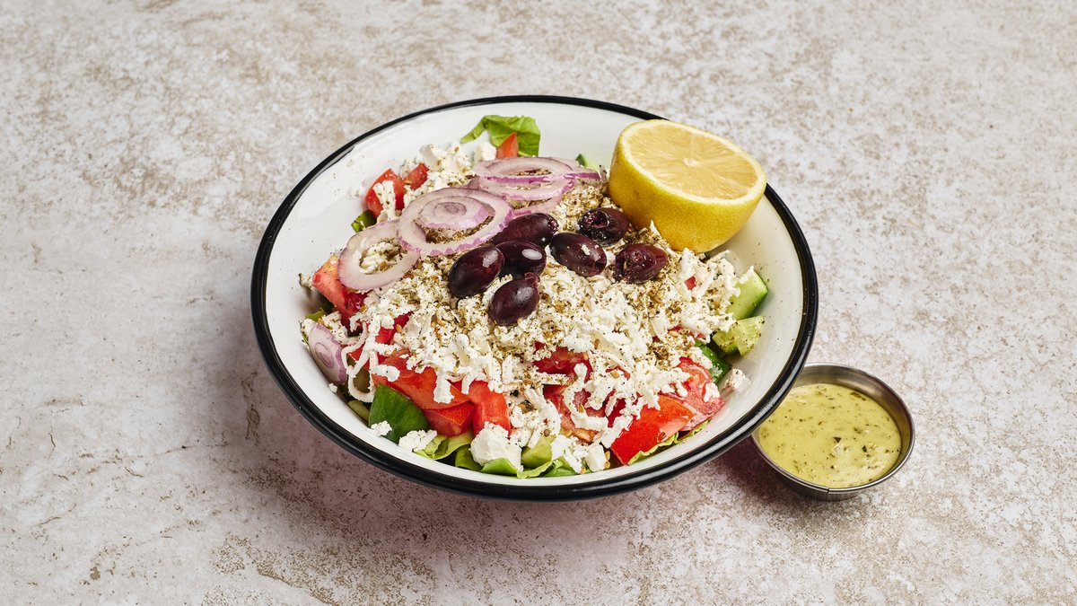 חסה, מלפפון, עגבנייה, שמן זית, זיתים ובצל סגול