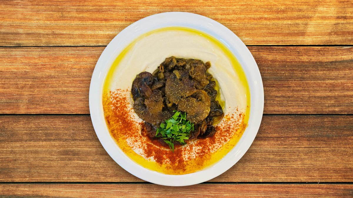 חומוס עם פטריות מוקפצות עם בצל, פטרוזיליה, שמן זית ותבלינים