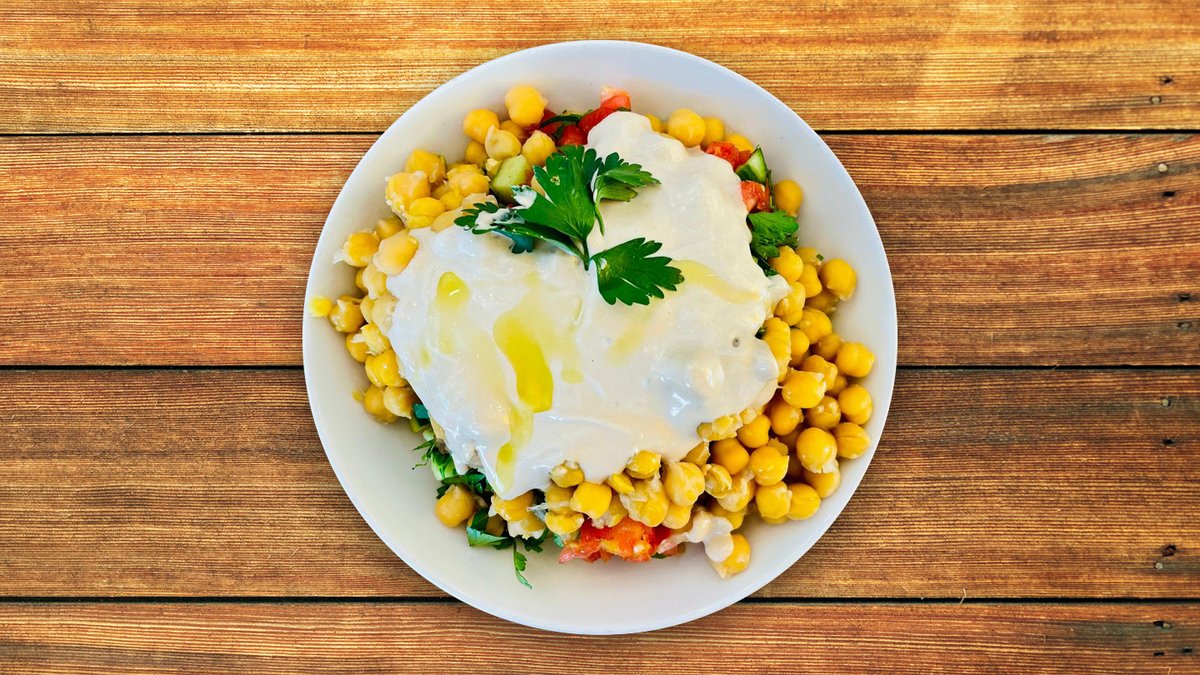 עגבניה, מלפפון, בצל, פטרוזיליה, גרגרי חומוס חמים, טחינה, שמן זית וקצת מיץ לימון