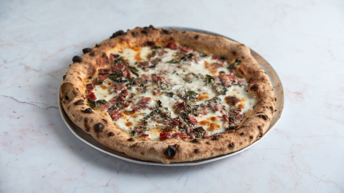 קרם פרמז'ן שום ופלפל שחור, מוצרלה, אורגנו ובייקון טלה