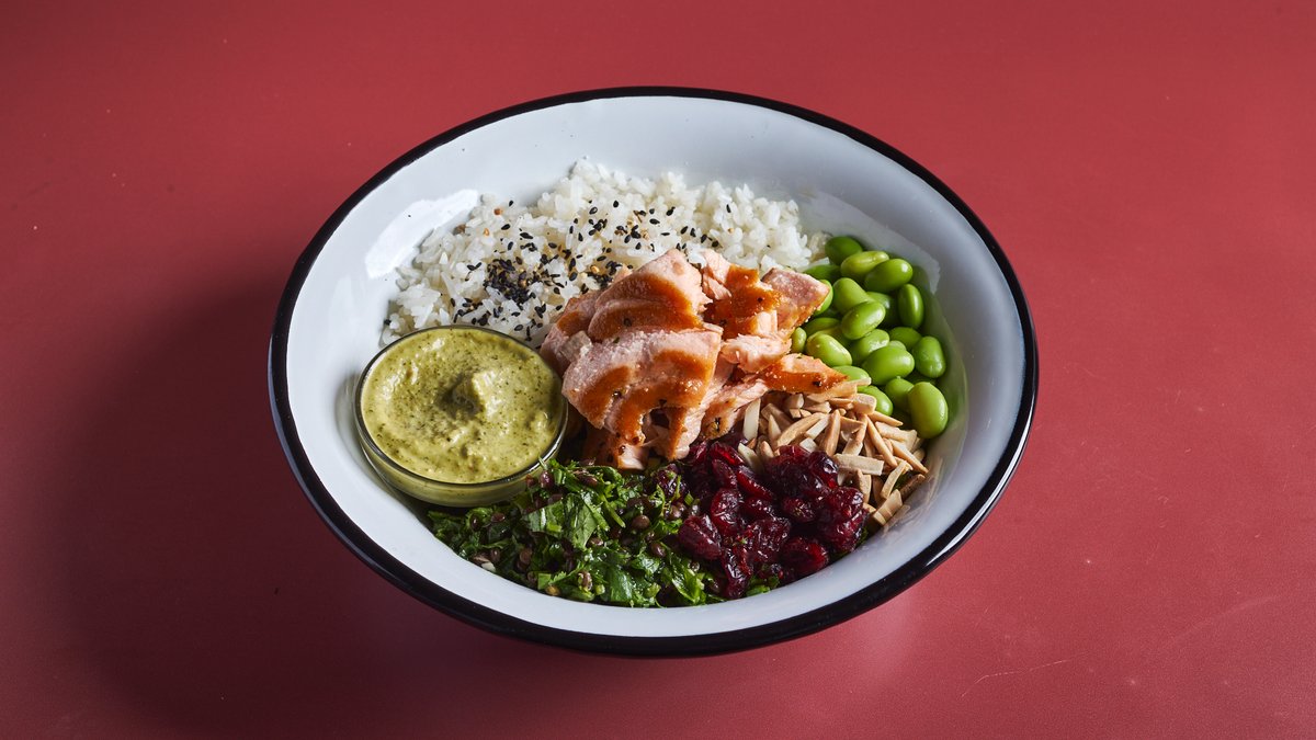 סלמון צרוב ומפורק על אורז, עשבי תיבול, עדשים שחורות, חמוציות, שקדים, אדממה, שומשום שחור, רוטב אסייתי מתובל ורוטב נוסף לבחירה