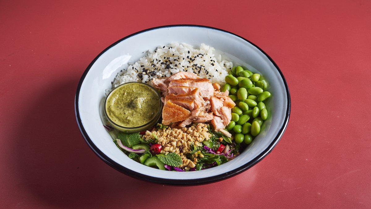 סלמון צרוב ומפורק על אורז, כרוב סגול, עשבי תיבול, מלפפון, שומשום שחור, בוטנים, צ׳ילי, אדממה, רוטב אסייתי מתובל ורוטב נוסף לבחירה