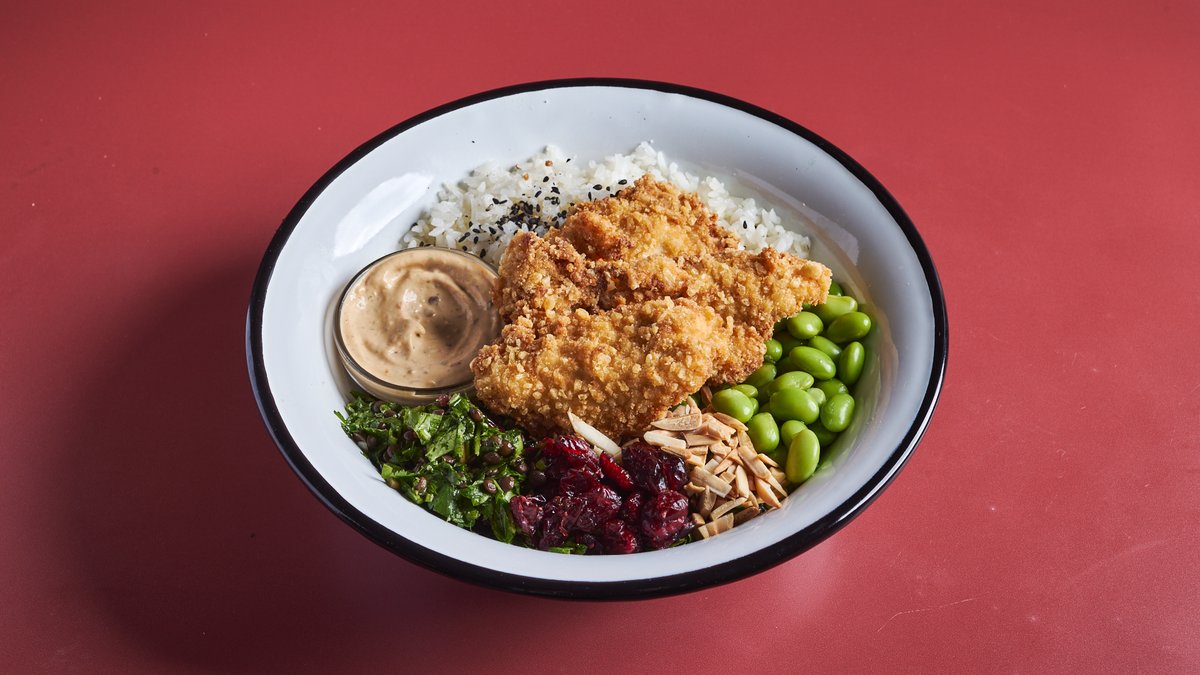 פילה עוף במרינדה עם ציפוי פריך על אורז, כרוב סגול, עשבי תיבול, מלפפון, שומשום שחור, בוטנים, צ׳ילי, אדממה, רוטב אסייתי מתובל ורוטב נוסף לבחירה