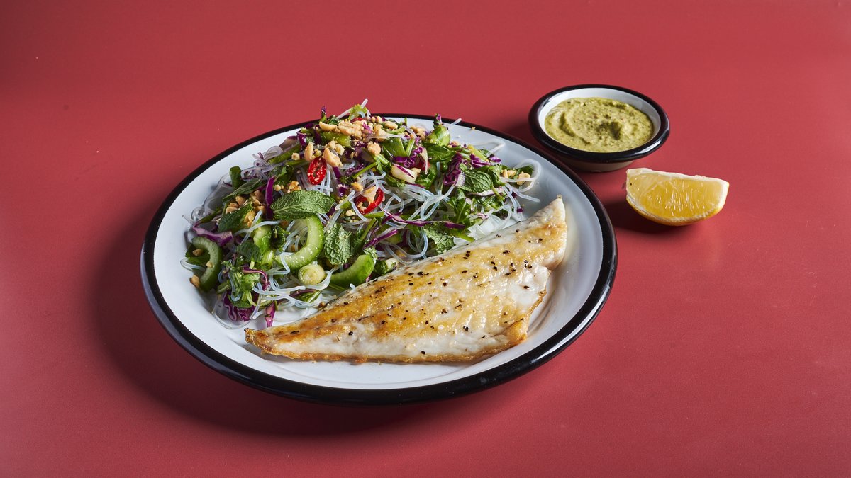 פילה לברק צרוב על הפלנצ׳ה, סלייס לימון, רוטב לבחירה ותוספת לבחירה