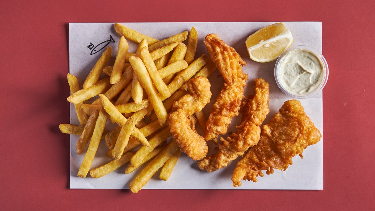 נתח קט פיש עסיסי בציפוי קריספי של ג׳וזף בלחמנייה רכה עם רוטב איולי טרטר, חסה, בצל מוחמץ, צ׳יפס בלגי ורוטב בצד לבחירה