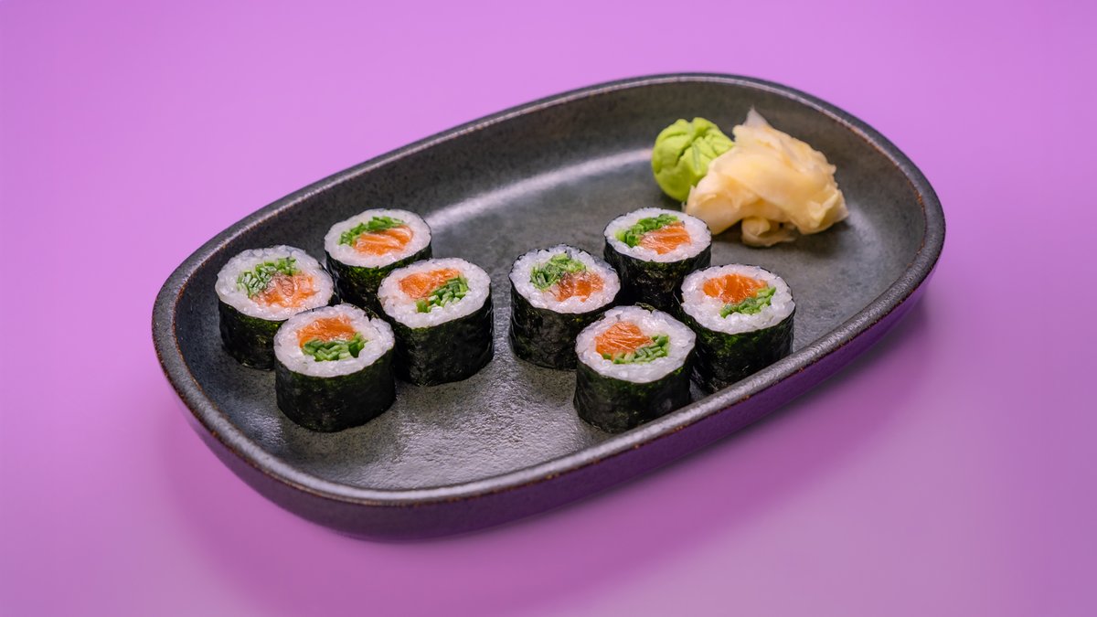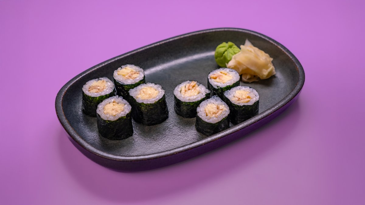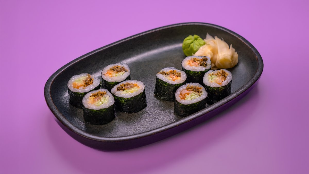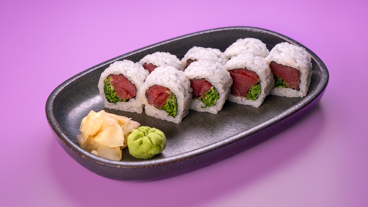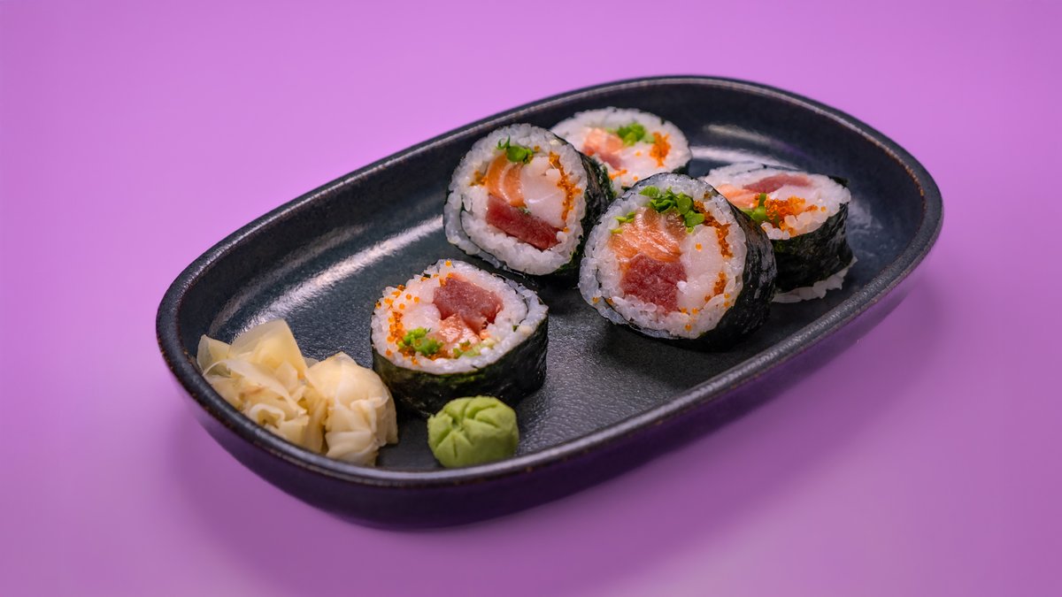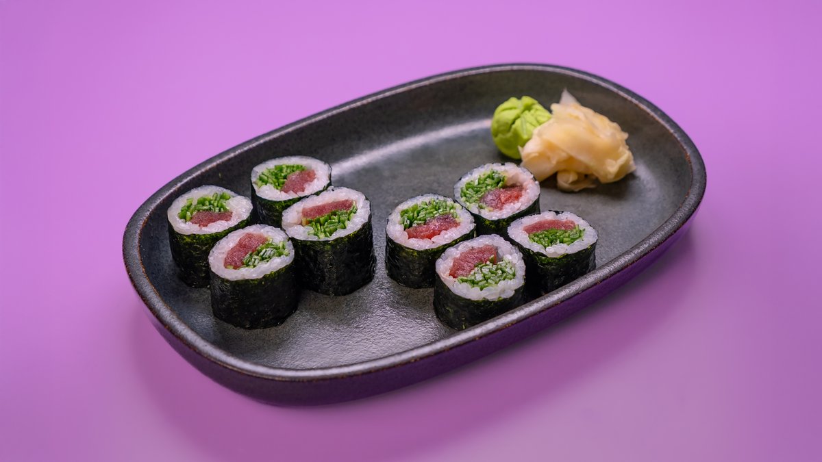 פרוסות של טונה, גומא, אצות נורי, צנונית, מלפפון ברוטב סומיסו ומוגש לצד רוטב מורומיג‘וי