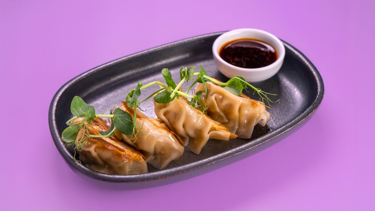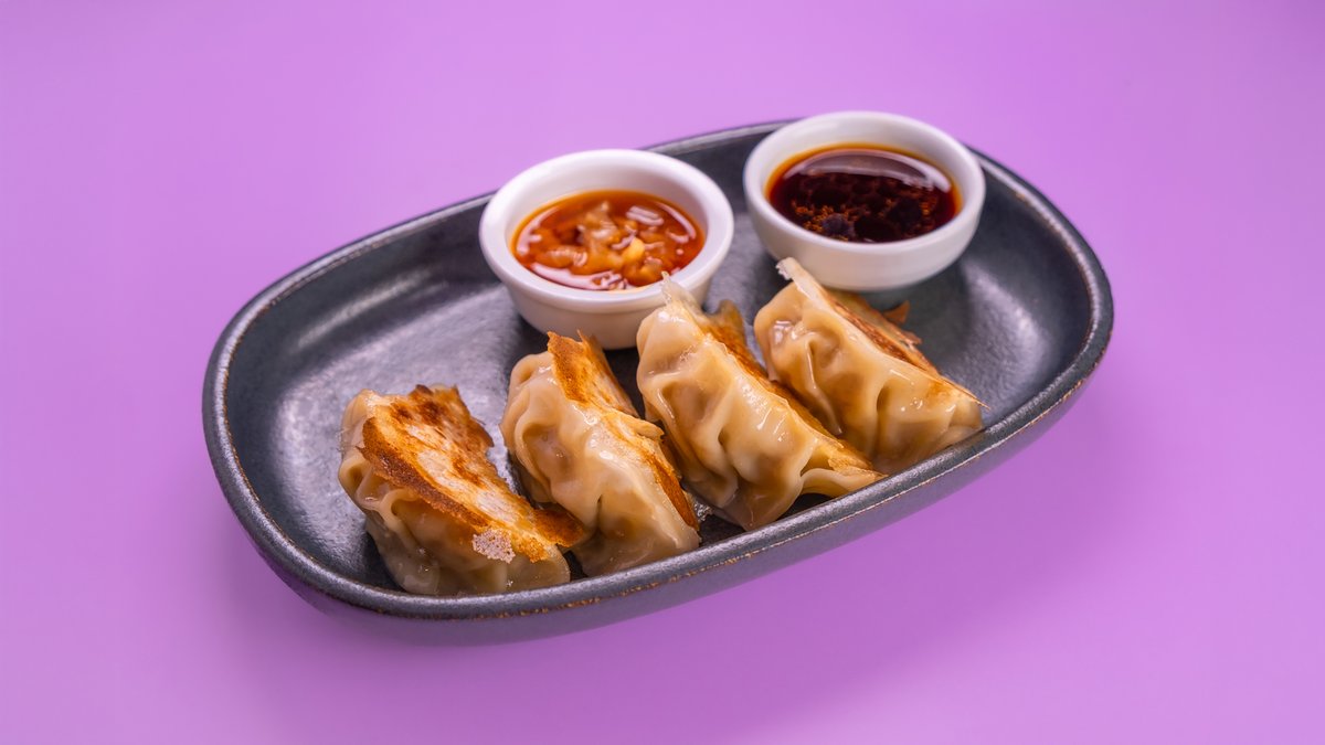 גיוזה תוצרת בית במילוי עוף, לצד רוטב סויה, חומץ אורז ושמן שומשום ומתבל צ'ילי פייסט יפני