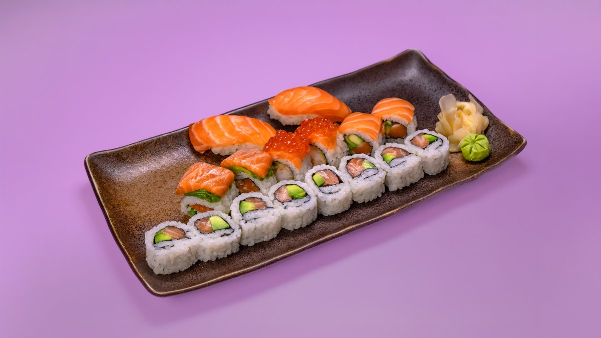 8 יח׳ סלמון אבוקדו, 2 יח׳ סלמון שרימפס רול, 2 יח׳ סלמון אפוי רול, 2 יח׳ ספייסי טורו סלמון רול 2 יח׳ ניגירי סלמון