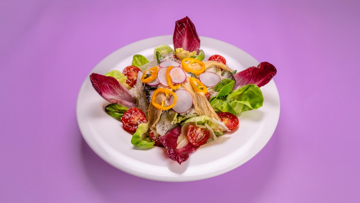 אייסברג, סלנובה, חסה משי ואנדיב ברוטב ויניגרט כמהין, פרמזן, יחד עם יובה, שורש לוטוס קריספי, עגבנייה וצנון *יובה - החלק השומני והמתוק של הטופו