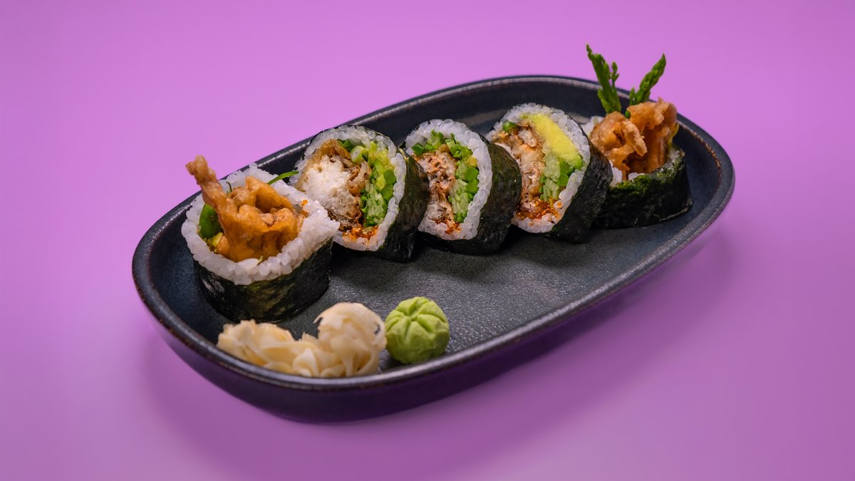 5 יח' של טמאגו, מלפפון, אספרגוס, קנפיו, אבוקדו, שבבי טמפורה, פטריות שיטאקי, בטטה בטמפורה ושומשום לבן