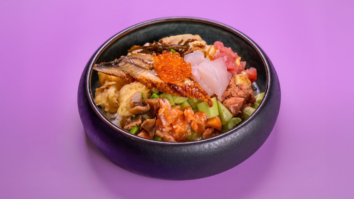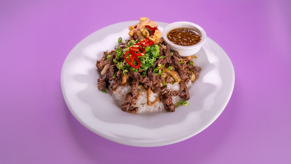 רצועות אנטריקוט, פטריות שימאג'י, על אורז לבן, בצל ירוק, פלפל בטמפורה ורוטב יאקיניקו