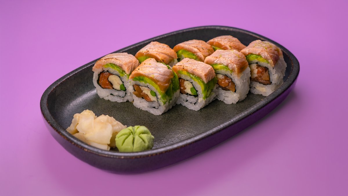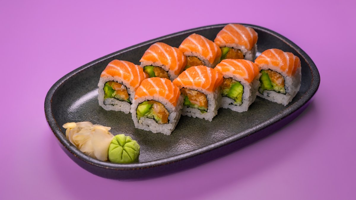 8 יח' של טורו סלמון, מלפפון, אבוקדו, בצל ירוק, טוביקו כתום, ספייסי מיונז וטופינג של סלמון מעל