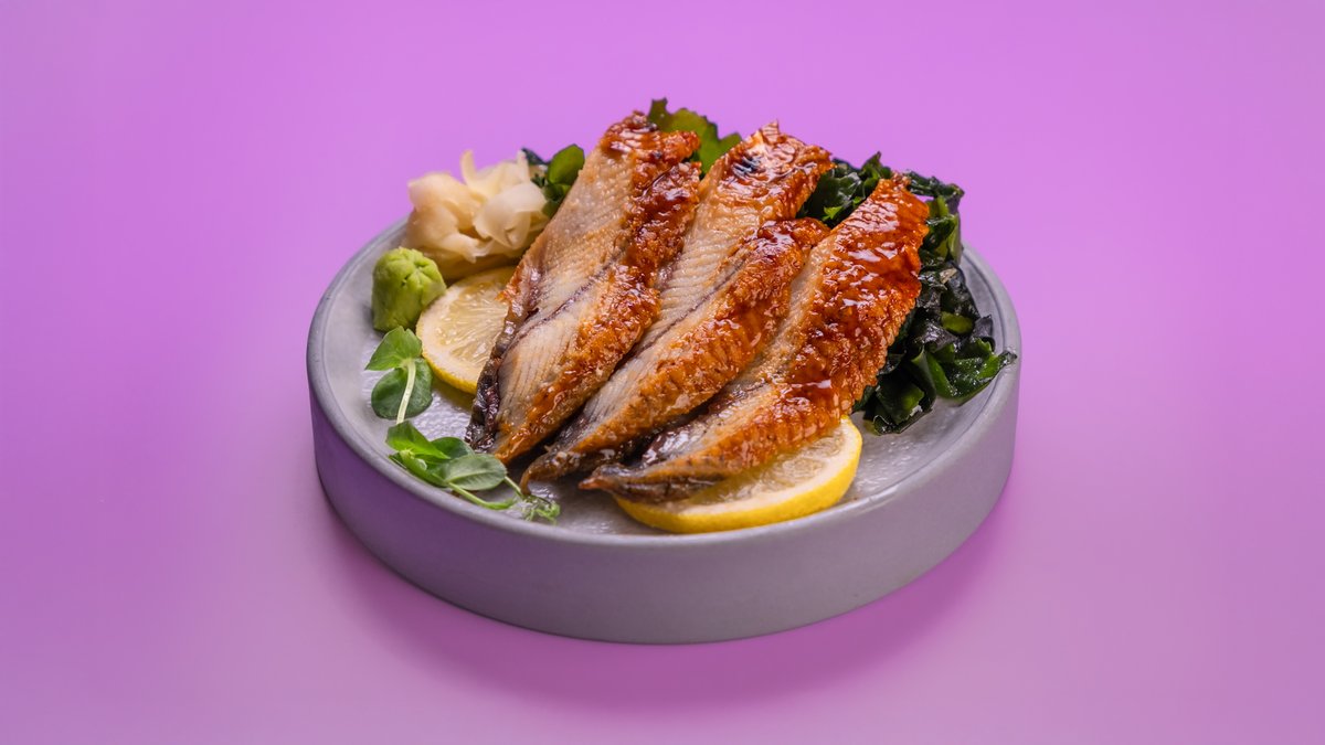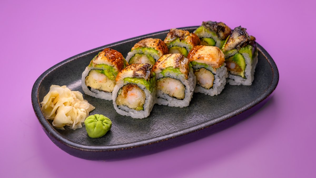 8 יח' של שרימפס בטמפורה, מלפפון, אבוקדו, עטוף בצלופח וטריאקי האונגי עשוי להכיל עצמות קטנות