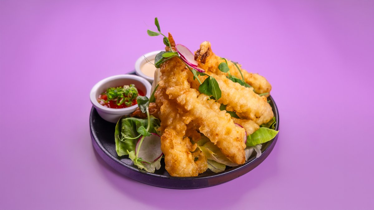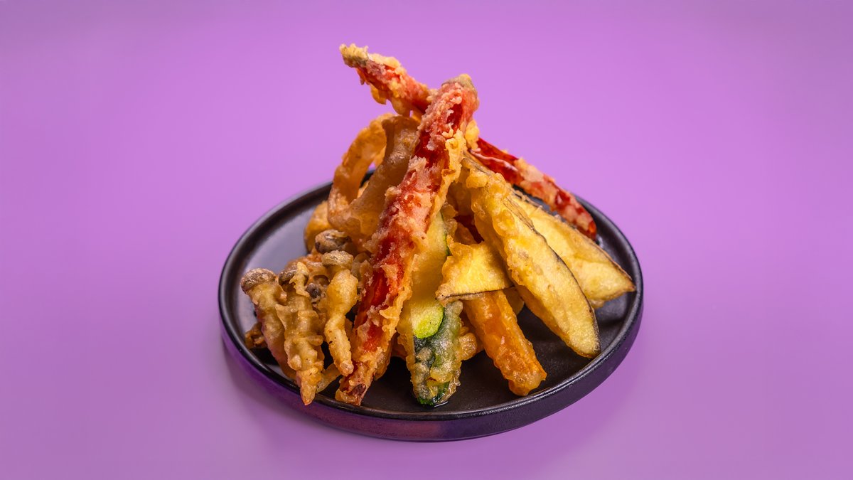 מבחר ירקות העונה בטמפורה עדינה לצד רוטב צ‘ויו