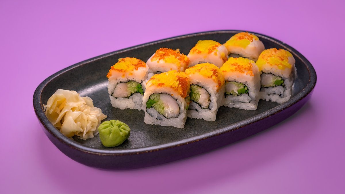 8 יח' של מלפפון, אבוקדו, בצל ירוק, שבבי טמפורה, טוביקו כתום וספייסי מיונז