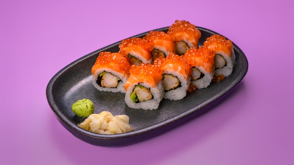 8 יח' של שרימפס בטמפורה, אבוקדו, מלפפון, ספייסי מיונז, עטוף בסלמון ואיקורה סלמון