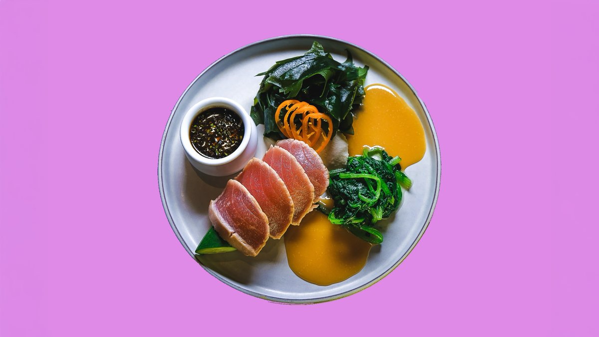 סלנובה, אייסברג, אנדיב, אצות וואקמה,בצל וסשימי סלמון מתובל בויניגרט יפני ומוגש לצד רוטב סומיסו