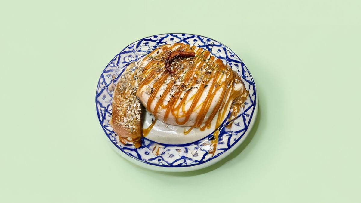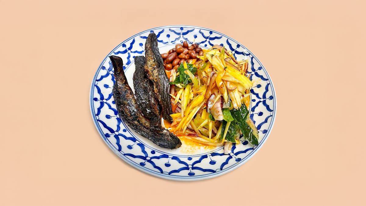 מנגו ירוק, בצל סגול, צילי תאילנדי, סלרי, בייקון מקרל, בוטנים, ריבת צילי, פיש סוס, ליים ותמרהינד. (המנה לא מכילה גלוטן 🌾)