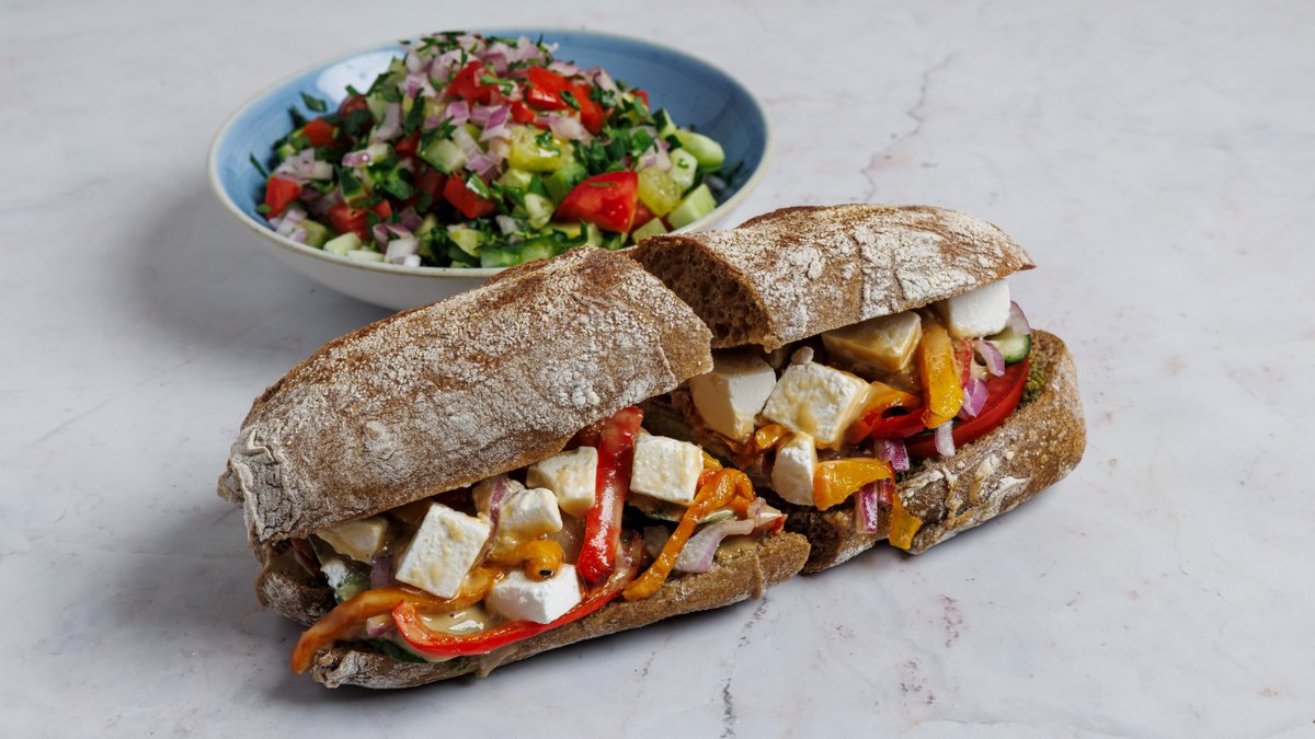 טופו 🌱/ פטה, פסטו, חסה, עגבניה, מלפפון, פלפל קלוי, בצל סגול, טחינה ונבטי אלפלפא