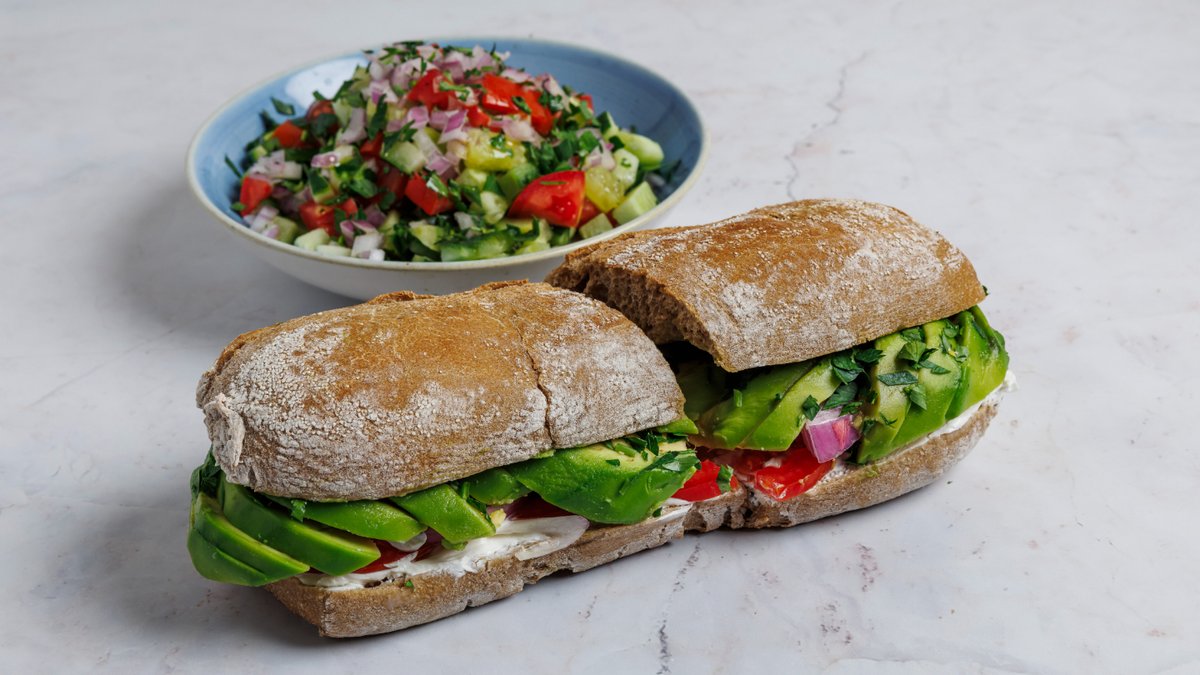 פרוסות אבוקדו, גבינת שמנת/ טחינה, חסה, עגבניה, בצל סגול, שאטה, צנוניות, נבטי אלפלפה, וצ'ימיצ'ורי פטרוזיליה